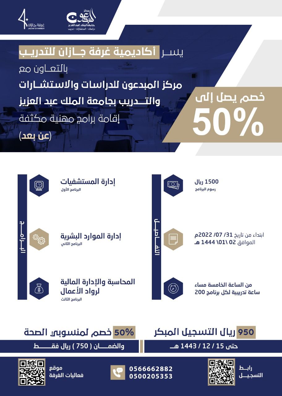 يسر أكاديمية غرفة جازان للتدريب بالتعاون مع مركز المبدعون بجامعة الملك عبد العزيز إقامة برامج مهنية مكثفة لمدة شهرين 200 ساعة تدريبية