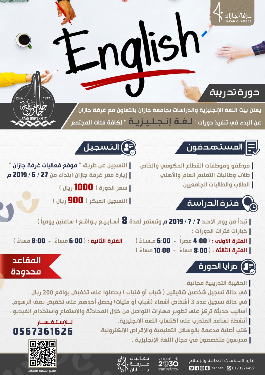 يعلن بيت اللغة الإنجليزية والدراسات بجامعة جازان بالتعاون مع غرفة جازان