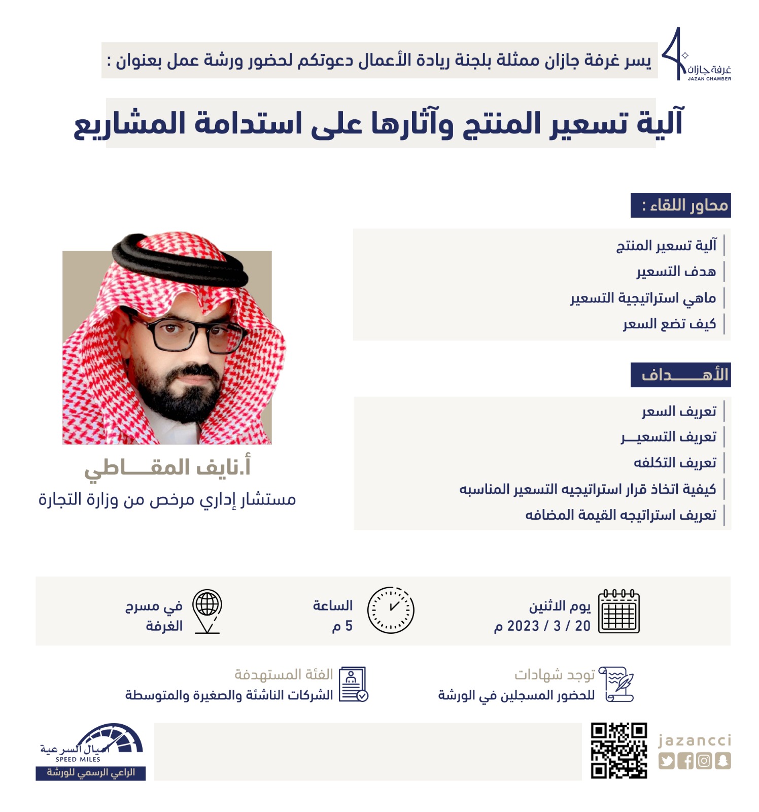 يسر غرفة جازان ممثلة بلجنة ريادة الأعمال دعوتكم لحضور ورشة عمل بعنوان