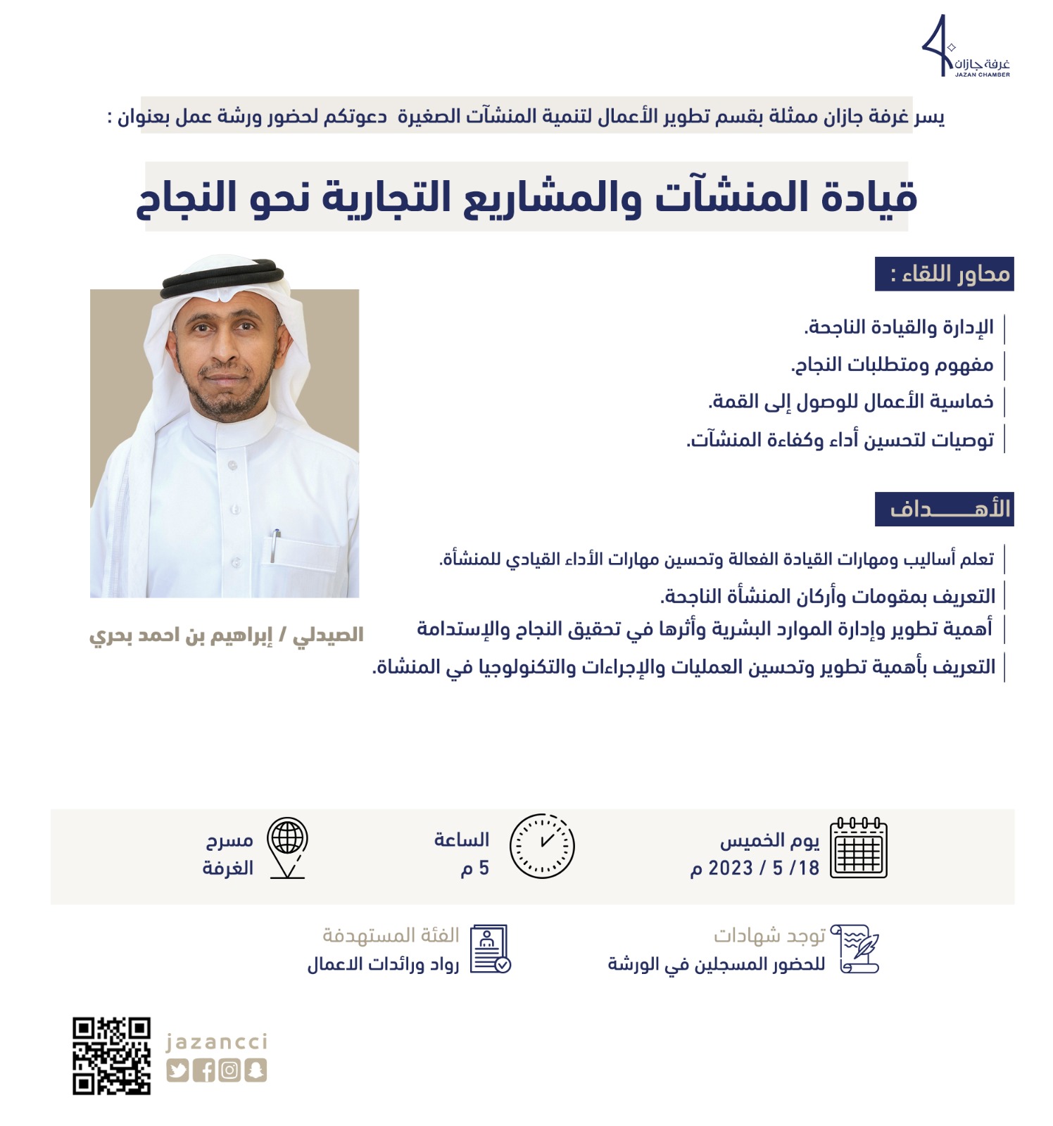 يسر غرفة جازان ممثلة بقسم تطوير الأعمال لتنمية المنشآت الصغيرة دعوتكم لحضورورشة عمل بعنوان: