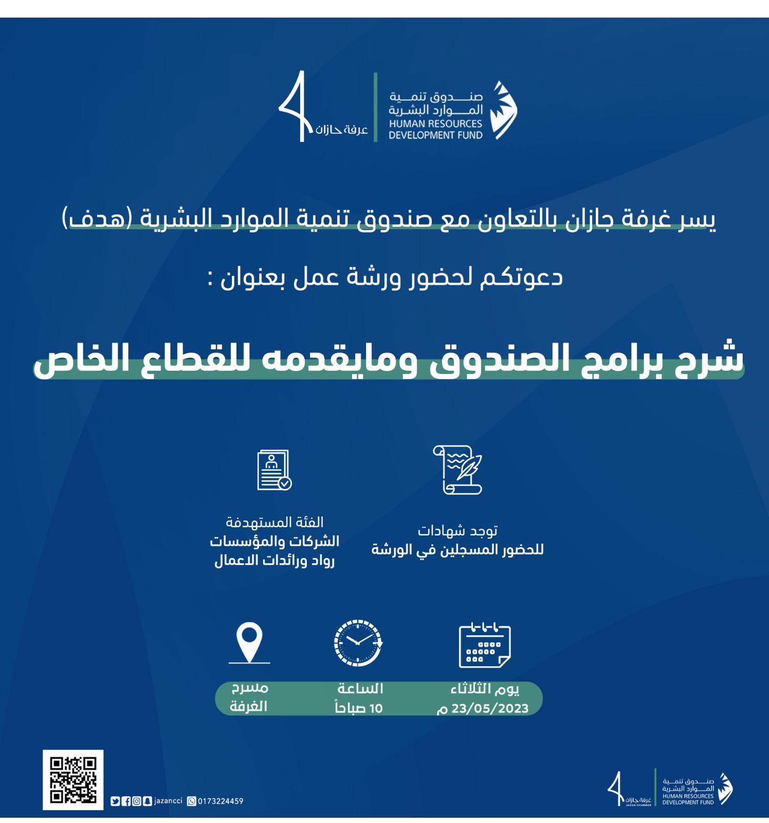 يسر غرفة جازان بالتعاون مع صندوق تنمية الموارد البشرية '' هدف''دعوتكم لحضور ورشة عمل بعنوان شرح برامج الصندوق ومايقدمه للقطاع الخاص