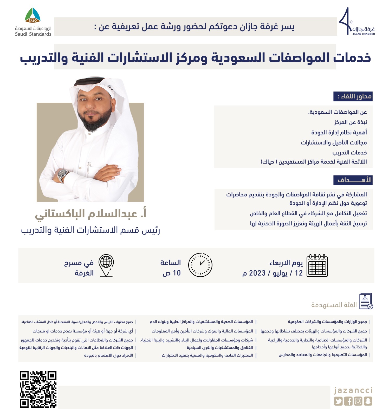 - المشاركة في نشر ثقافة المواصفات والجودة بتقديم محاضرات توعوية حول نظم الإدارة أو الجودة