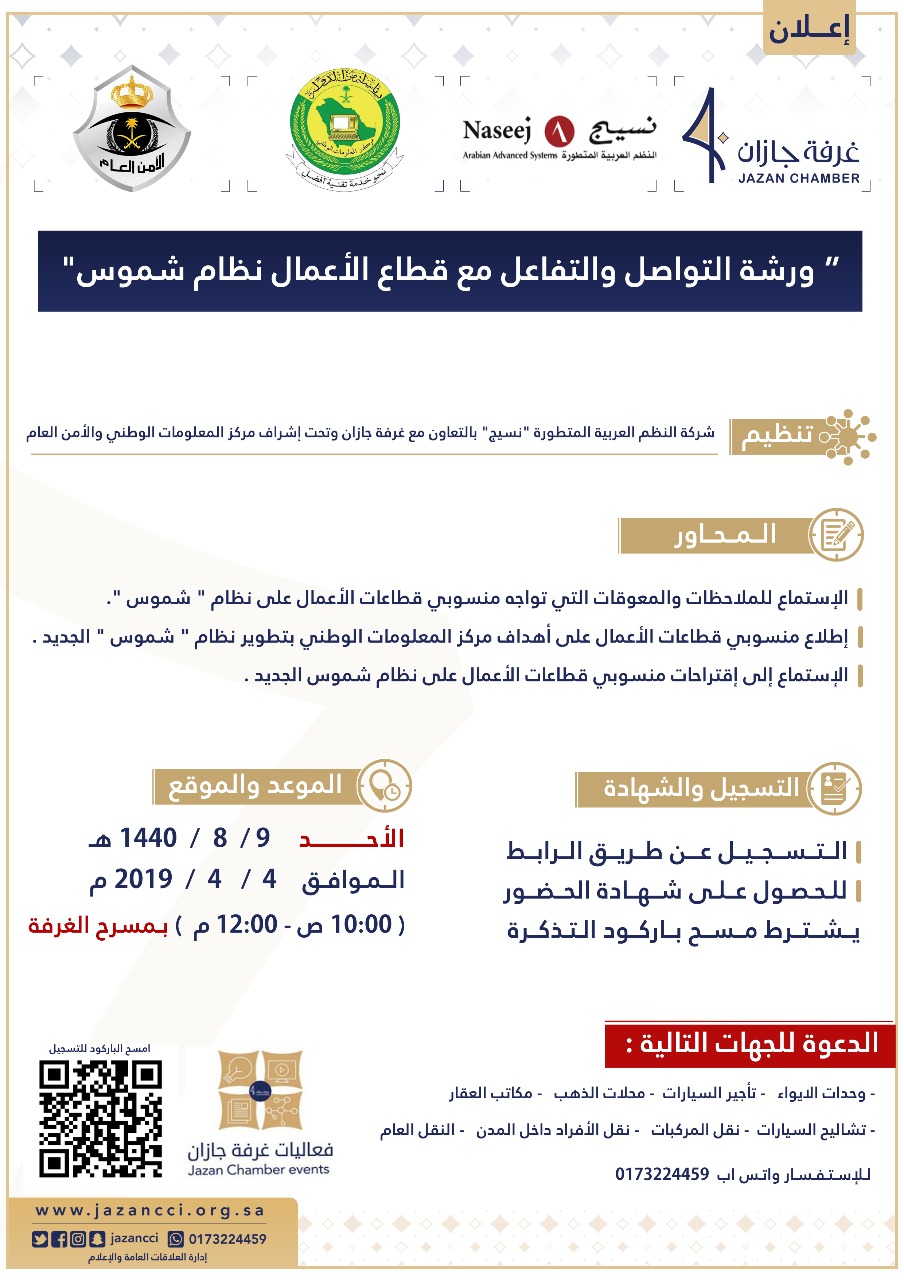 تنظيم شركة النظم العربية المتطورة "نسيج" بالتعاون مع غرفة جازان وتحت إشراف مركز المعلومات الوطني والأمن العام.